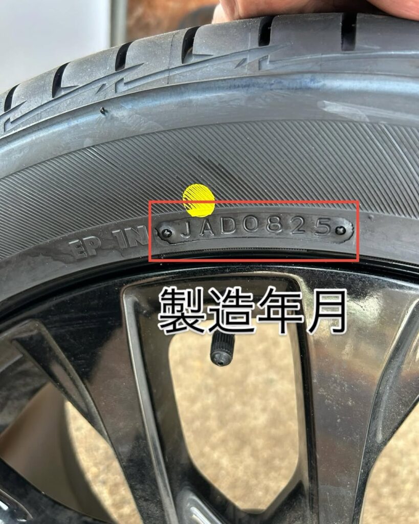 タイヤの側面には製造年月が刻印されています。例えば「0825」という数字は、2025年の第8週(2月末頃)に製造されたことを示しています。タイヤは一般的に4~5年で経年劣化が進み、ヒビ割れやグリップ力の低下につながります。古すぎるタイヤはスリップやバーストの危険性が高まるため要注意です。