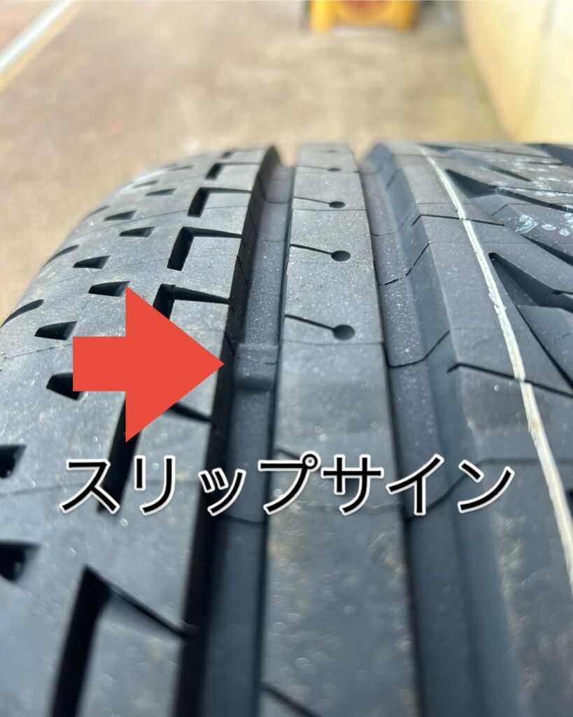 タイヤの側面には三角形のマークがあります。この三角マークの示す場所の溝にある「スリップサイン」が、周囲のタイヤ溝と同じ高さになったら交換時期です。溝の深さは安全な制動距離に大きく関わります。